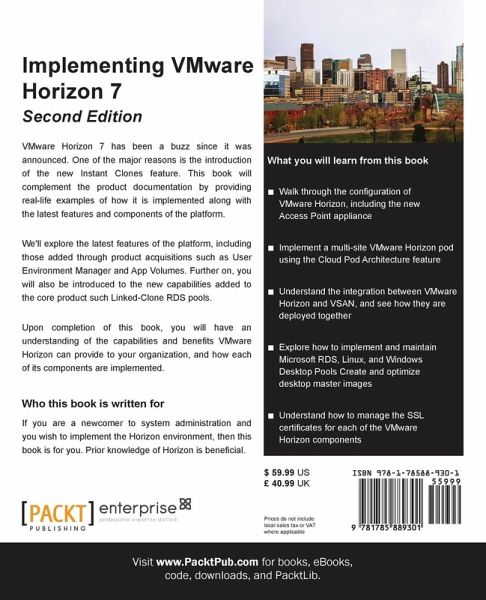 A comprehensive, practical guide to accessing virtual desktops, applications, and services through a unified platform Key Features This is the first book on the market that delivers desktops and applications through a single Virtual Desktop Infrastructure platform Reduce enterprise costs by dynamically allocating resources with virtual storage, compute and networking This comprehensive guide provides simplified operations, improved security, and accelerated time-to-value using VMware Horizon 7 Book Description VMware Horizon 7 has been a buzz since it was announced. One of the major reasons is the introduction of the new Instant Clones feature. This book will complement the product documentation by providing real-life examples of how it is implemented along with the latest features and components of the platform. We'll explore the latest features of the platform, including those added through product acquisitions such as User Environment Manager and App Volumes. Further on, you will also be introduced to the new capabilities added to the core product such Linked-Clone RDS pools. Upon completion of this book, you will have an understanding of the capabilities and benefits VMware Horizon can provide to your organization, and how each of its components are implemented. What You Will Learn Walk through the configuration of VMware Horizon, including the new Horizon Access Point appliance Implement a multi-site VMware Horizon pod using the Cloud Pod Architecture feature Understand the integration between VMware Horizon and VSAN, and see how they are deployed together Explore how to implement and maintain Microsoft RDS and Linux and Windows Desktop Pools Create and optimize desktop master images. Understand how to manage the SSL certificates for each of the VMware Horizon components. Who This Book Is For If you are a newcomer to system administration, and you wish to implement the Horizon environment, then this book is for you. Prior knowledge of Horizon is beneficial.