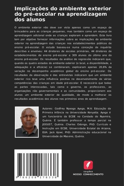 O ambiente exterior não deve ser visto apenas como um espaço de brincadeira para as crianças pequenas, mas também como um espaço de aprendizagem adicional onde as crianças exploram e aprendem. Este livro tem por objetivo fornecer informações sobre as implicações do ambiente exterior na aprendizagem das crianças nos estabelecimentos públicos de ensino pré-escolar. O estudo baseou-se numa conceção de inquérito descritivo e envolveu: 44 diretores de escolas primárias, 44 diretores de estabelecimentos de ensino pré-escolar e 309 alunos do último ano do ensino pré-escolar. Os resultados da análise de regressão indicaram que, quando os quatro estados do ambiente exterior (o local, a disponibilidade, a adequação e a eficácia) se combinaram, explicaram apenas 20,6% da variação no desempenho académico global do ensino pré-escolar. Os resultados da observação e das entrevistas indicaram que um ambiente exterior rico teve uma influência positiva no desenvolvimento de várias competências das crianças em idade pré-escolar. É necessário que todas as partes interessadas, tais como o governo, os professores, as organizações não governamentais e as comunidades, proporcionem aos alunos um ambiente exterior de qualidade, de modo a melhorar os resultados académicos dos alunos nos primeiros anos de aprendizagem.