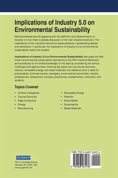 Most businesses are still grappling with the definition and implementation of Industry 4.0, but there is already discussion of the next industrial revolution. The coexistence of two industrial revolutions raises problems, necessitating debate and clarification. In particular, the implications of Industry 5.0 on environmental sustainability need to be studied. Implications of Industry 5.0 on Environmental Sustainability discusses the little-known environmental sustainability implications of the Fifth Industrial Revolution and contributes to the limited knowledge on this topic by considering the various challenges and opportunities. Covering key topics such as circular economy, robotics, renewable energy, and waste materials, this reference work is ideal for policymakers, business owners, managers, environmental economists, industry professionals, researchers, scholars, practitioners, academicians, instructors, and students.