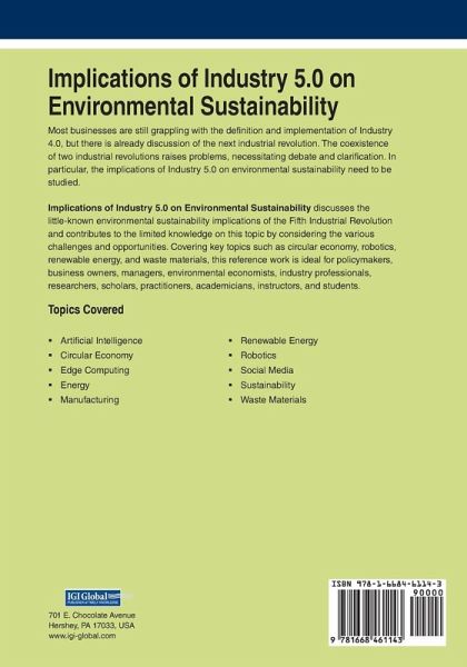 Most businesses are still grappling with the definition and implementation of Industry 4.0, but there is already discussion of the next industrial revolution. The coexistence of two industrial revolutions raises problems, necessitating debate and clarification. In particular, the implications of Industry 5.0 on environmental sustainability need to be studied. Implications of Industry 5.0 on Environmental Sustainability discusses the little-known environmental sustainability implications of the Fifth Industrial Revolution and contributes to the limited knowledge on this topic by considering the various challenges and opportunities. Covering key topics such as circular economy, robotics, renewable energy, and waste materials, this reference work is ideal for policymakers, business owners, managers, environmental economists, industry professionals, researchers, scholars, practitioners, academicians, instructors, and students.