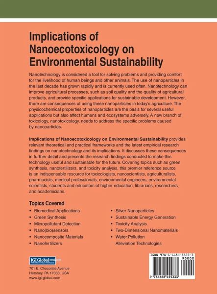 Nanotechnology is considered a tool for solving problems and providing comfort for the livelihood of human beings and other animals. The use of nanoparticles in the last decade has grown rapidly and is currently used often. Nanotechnology can improve agricultural processes, such as soil quality and the quality of agricultural products, and provide specific applications for sustainable development. However, there are consequences of using these nanoparticles in today's agriculture. The physicochemical properties of nanoparticles are the basis for several useful applications but also affect humans and ecosystems adversely. A new branch of toxicology, nanotoxicology, needs to address the specific problems caused by nanoparticles. Implications of Nanoecotoxicology on Environmental Sustainability provides relevant theoretical and practical frameworks and the latest empirical research findings on nanotechnology and its implications. It discusses these consequences in further detail and presents the research findings conducted to make this technology useful and sustainable for the future. Covering topics such as green synthesis, nanofertilizers, and toxicity analysis, this premier reference source is an indispensable resource for toxicologists, nanoscientists, agriculturalists, pharmacists, medical professionals, environmental engineers, environmental scientists, students and educators of higher education, librarians, researchers, and academicians.