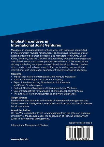 Managers in international joint ventures work with resources contributed by investors from multiple nationalities. Fan Wu shows through a series of experimental studies among students and managers from China, South Korea, Germany, and the USA that cultural affinity between the manager and one of the investors and career perspectives with one of the investors are strongly motivating managers to make biased decisions. The two mechanisms can be used to balance each other out in staffing key positions in international joint ventures for optimal control over managerial decisions.
