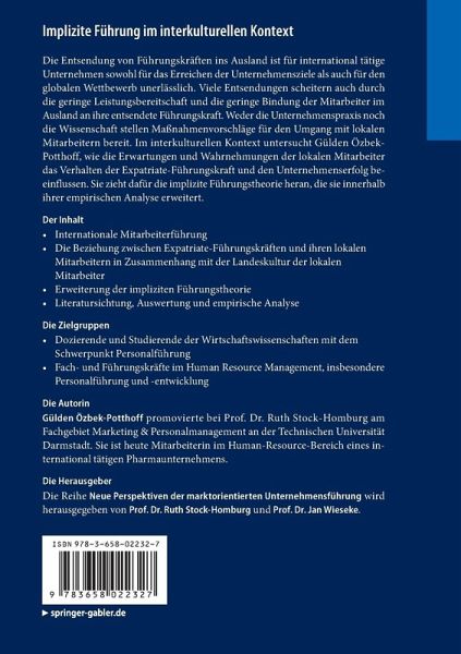 Die Entsendung von Führungskräften ins Ausland ist für international tätige Unternehmen sowohl für das Erreichen der Unternehmensziele als auch für den globalen Wettbewerb unerlässlich. Eine große Anzahl dieser Entsendungen scheitern u. a. durch die geringe Leistungsbereitschaft aber auch durch die geringe Bindung der Mitarbeiter im Ausland an ihre entsendete Führungskraft. Weder die Unternehmenspraxis noch die Wissenschaft stellen Maßnahmenvorschläge bezüglich der lokalen Mitarbeiter bereit. Gülden Özbek-Potthoff untersucht iminterkulturellen Kontext, welchen Einfluss die Erwartungen und Wahrnehmungen der lokalen Mitarbeiter gegenüber ihrer Expatriate-Führungskraft in Bezug auf das Mitarbeiterverhalten und den Unternehmenserfolg haben. Sie zieht dafür die implizite Führungstheorie heran, die sie innerhalb ihrer empirischen Analyse erweitert.