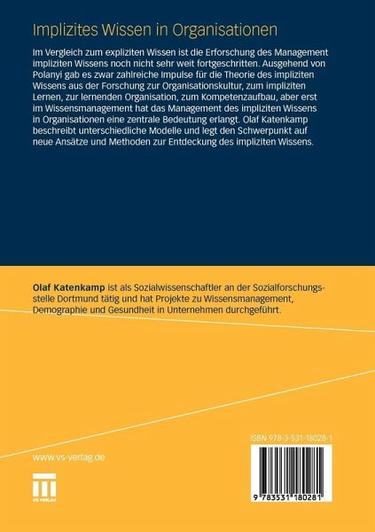Im Vergleich zum expliziten Wissen ist die Erforschung des Management impliziten Wissens noch nicht sehr weit fortgeschritten. Ausgehend von Polanyi gab es zwar zahlreiche Impulse für die Theorie des impliziten Wissens aus der Forschung zur Organisationskultur, zum impliziten Lernen, zur lernenden Organisation, zum Kompetenzaufbau, aber erst im Wissensmanagement hat das Management des impliziten Wissens in Organisationen eine zentrale Bedeutung erlangt. Olaf Katenkamp beschreibt unterschiedliche Modelle und legt den Schwerpunkt auf neue Ansätze und Methoden zur Entdeckung des impliziten Wissens.
