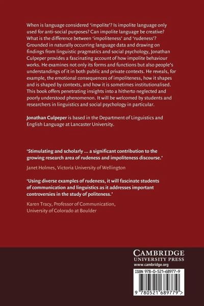 When is language considered 'impolite'? Is impolite language only used for anti-social purposes? Can impolite language be creative? What is the difference between 'impoliteness' and 'rudeness'? Grounded in naturally-occurring language data and drawing on findings from linguistic pragmatics and social psychology, Jonathan Culpeper provides a fascinating account of how impolite behaviour works. He examines not only its forms and functions but also people's understandings of it in both public and private contexts. He reveals, for example, the emotional consequences of impoliteness, how it shapes and is shaped by contexts, and how it is sometimes institutionalised. This book offers penetrating insights into a hitherto neglected and poorly understood phenomenon. It will be welcomed by students and researchers in linguistics and social psychology in particular. When is language considered 'impolite'? Is impolite language only used for anti-social purposes? What is the difference between 'impoliteness' and 'rudeness'? Grounded in naturally-occurring language data and drawing on findings from linguistic pragmatics and social psychology, Jonathan Culpeper provides a fascinating account of how impolite behaviour works.