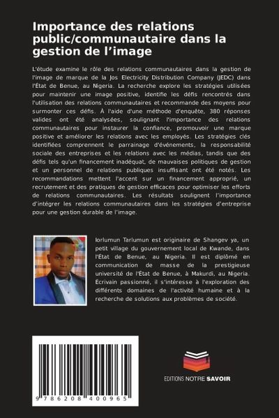 L'étude examine le rôle des relations communautaires dans la gestion de l'image de marque de la Jos Electricity Distribution Company (JEDC) dans l'État de Benue, au Nigeria. La recherche explore les stratégies utilisées pour maintenir une image positive, identifie les défis rencontrés dans l'utilisation des relations communautaires et recommande des moyens pour surmonter ces défis. À l'aide d'une méthode d'enquête, 380 réponses valides ont été analysées, soulignant l'importance des relations communautaires pour instaurer la confiance, promouvoir une marque positive et améliorer les relations avec les employés. Les stratégies clés identifiées comprennent le parrainage d'événements, la responsabilité sociale des entreprises et les relations avec les médias, tandis que des défis tels qu'un financement inadéquat, de mauvaises politiques de gestion et un personnel de relations publiques insuffisant ont été notés. Les recommandations mettent l'accent sur un financement approprié, un recrutement et des pratiques de gestion efficaces pour optimiser les efforts de relations communautaires. Les résultats soulignent l'importance d'intégrer les relations communautaires dans les stratégies d'entreprise pour une gestion durable de l'image.