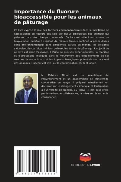 Ce livre expose le rôle des facteurs environnementaux dans la facilitation de l'accessibilité du fluorure des sols aux tissus biologiques des animaux qui paissent dans des champs contaminés. Ce livre est utile à un moment où l'exploitation minière historique de métaux ferreux continue à poser divers défis environnementaux dans différentes parties du monde, les polluants s'écoulant de ces sites miniers polluant les terres de pâturage. L'objectif de ce livre est donc d'exposer, à l'aide de preuves expérimentales, la manière et le processus impliqués dans le mouvement des oligo-éléments du sol vers les tissus animaux et les impacts biologiques potentiels sur la santé des animaux. L'accent est mis sur la contamination par le fluorure.