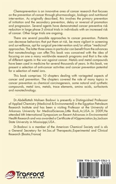 Chemoprevention is an innovative area of cancer research that focuses on the prevention of cancer through pharmacologic, biologic, and nutritional intervention. As originally described, this involves the primary prevention of initiation and the secondary prevention, delay, or reversal of promotion and progression. Several agents have demonstrated cancer preventive risk reduction in large phase three clinical trials in individuals with an increased risk of cancer. Other large trials are ongoing. There are several possible approaches to cancer prevention. Patients can decrease behaviors that put them at risk, be more vigilant in screening and surveillance, opt for surgical preintervention, and/or utilize "medicinal" approaches. The latter three areas in particular can benefit from the advances that nanotechnology can offer.This book was conceived with the idea of focusing on one a many worldwide research programs, and that is the role of different agents in the war against cancer. Metals and metal compounds have been used in medicine for several thousands of years. In this book, we present a selection of anticancer activities and cancer prevention potential for a selection of metal ions. This book comprises ten chapters dealing with variegated aspects of cancer and prevention. The chapters covered the role of many topics in cancer prevention as chemical carcinogenesis, some natural and synthetic compounds, metal ions, metals, trace elements, amino acids, surfactants, and nanotechnology.