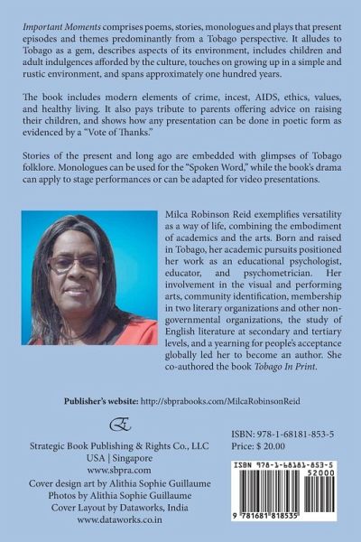 Important Moments comprises poems, stories, monologues and plays that present episodes and themes predominantly from a Tobago perspective. It alludes to Tobago as a gem, describes aspects of its environment, includes children and adult indulgences afforded by the culture, touches on growing up in a simple and rustic environment, and spans approximately one hundred years. The book includes modern elements of crime, incest, AIDS, ethics, values, and healthy living. It also pays tribute to parents offering advice on raising their children, and shows how any presentation can be done in poetic form as evidenced by a "Vote of Thanks." Stories of the present and long ago are embedded with glimpses of Tobago folklore. Monologues can be used for the "Spoken Word," while the book's drama can apply to stage performances or can be adapted for video presentations. Milca Robinson Reid exemplifies versatility as a way of life, combining the embodiment of academics and the arts. Born and raised in Tobago, her academic pursuits positioned her work as an educational psychologist, educator, and psychometrician. Her involvement in the visual and performing arts, community identification, membership in two literary organizations and other non-governmental organizations, the study of English literature at secondary and tertiary levels, and a yearning for people's acceptance globally led her to become an author. She co-authored the book Tobago In Print. Publisher's website: http://sbprabooks.com/MilcaRobinsonReid
