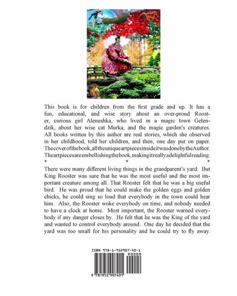 This book is for children from the first grade and up. It has a fun, educational, and wise story about an over-proud Rooster, curious girl Alenushka, who lived in a magic town Gelendzik, about her wise cat Murka, and the magic garden's creatures. All books written by this author are real stories, which she observed in her childhood, told her children, and then, one day put on paper. The cover of the book, all the unique art pieces inside it was done by the Author. The art pieces are embellishing the book, making it really a delightful reading. *** There were many different living things in the grandparent's yard. But King Rooster was sure that he was the most useful and the most important creature among all. That Rooster felt that he was a big useful bird. He was proud that he could make the golden eggs and golden chicks, he could sing so loud that everybody in the town could hear him. Also, the Rooster woke everybody on time, and nobody needed to have a clock at home. Most important, the Rooster warned everybody if any danger closes by. He felt that he was the King of the yard and wanted to control everybody around. One day he decided that the yard was too small for his personality and he could try to fly away.