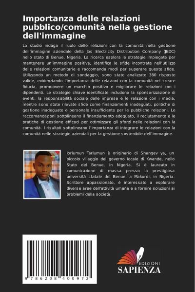 Lo studio indaga il ruolo delle relazioni con la comunità nella gestione dell'immagine aziendale della Jos Electricity Distribution Company (JEDC) nello stato di Benue, Nigeria. La ricerca esplora le strategie impiegate per mantenere un'immagine positiva, identifica le sfide incontrate nell'utilizzo delle relazioni comunitarie e raccomanda modi per superare queste sfide. Utilizzando un metodo di sondaggio, sono state analizzate 380 risposte valide, evidenziando l'importanza delle relazioni con la comunità nel creare fiducia, promuovere un marchio positivo e migliorare le relazioni con i dipendenti. Le strategie chiave identificate includono la sponsorizzazione di eventi, la responsabilità sociale delle imprese e le relazioni con i media, mentre sono state rilevate sfide come finanziamenti inadeguati, politiche di gestione inadeguate e personale insufficiente per le pubbliche relazioni. Le raccomandazioni sottolineano il finanziamento adeguato, il reclutamento e le pratiche di gestione efficaci per ottimizzare gli sforzi nelle relazioni con la comunità. I risultati sottolineano l'importanza di integrare le relazioni con la comunità nelle strategie aziendali per la gestione sostenibile dell'immagine.