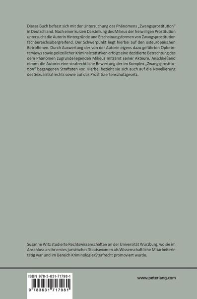 Dieses Buch befasst sich mit der Untersuchung des Phänomens «Zwangsprostitution» in Deutschland. Nach einer kurzen Darstellung des Milieus der freiwilligen Prostitution untersucht die Autorin Hintergründe und Erscheinungsformen von Zwangsprostitution fachbereichsübergreifend. Der Schwerpunkt liegt hierbei auf den osteuropäischen Betroffenen. Durch Auswertung der von der Autorin eigens dazu geführten Opferinterviews sowie polizeilicher Kriminalstatistiken erfolgt eine dezidierte Betrachtung des dem Phänomen zugrundeliegenden Milieus mitsamt seiner Akteure. Anschließend nimmt die Autorin eine strafrechtliche Bewertung der im Komplex «Zwangsprostitution» begangenen Straftaten vor. Hierbei bezieht sie sich auch auf die Novellierung des Sexualstrafrechts sowie auf das Prostituiertenschutzgesetz.