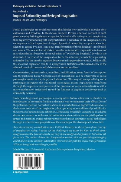 Social pathologies are social processes that hinder how individuals exercise their autonomy and freedom. In this book, Gustavo Pereira offers an account of such phenomena by defining them as a cognitive failure that affects the practical imagination, thus negatively interfering with our practical life. This failure of the imagination is the consequence of the imposition of a type of practical rationality on a practical context alien to it, caused by a non conscious transformation of the individuals' set of beliefs and values. The research undertaken provides an innovative explanation in terms of microfoundations based on the mechanism of "availability heuristic", by which the diminished exercise of the imagination turns the intuitively available or prevailing rationality into the one that regulates behaviour in inappropriate contexts. Additionally, this incorrect regulation results in a progressive distortion of the shared sense of the affected practical contexts, which becomes institutionalized.