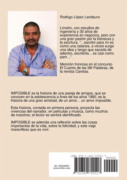 Imposible es una historia centrada en 2 jóvenes que se conocieron en la adolescencia, y que a pesar de que existe una fuerte atracción mutua, no es hasta cuando son adultos que llegan a intentar vivir el amor que persiste entre ambos a pesar de los años. El destino le pone muchas piedras en el camino a este amor, que sin embargo se resiste a desaparecer. Es la historia de un amor imposible. La narración navega por anécdotas de adolescentes y las complicaciones en la vida de los adultos jóvenes, y se proyecta muchas veces en películas y canciones, de la misma forma que todos nos identificamos alguna vez con las historias que vemos en el cine o las canciones que nos emocionan por sus letras. La historia se matiza con reflexiones y lecciones acerca de la vida, y de las cosas verdaderamente importantes. Espero que Imposible lo haga reír, lo haga llorar, lo emocione y lo haga pensar. La vida es muy corta...