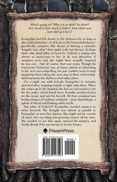 What's going on? Why is it so dark? So silent? Am I dead or just stuck in limbo? And either way ... how did I get here? Evangeline had felt drawn to the darkness for as long as she could remember-or at least to the fictional darkness-specifically vampires. The dream of sharing a romantic "happily ever after" that might truly last forever. Perhaps that's why she'd fallen so hard for Gabriel, a young man almost as mysterious to her as he was attractive. If vampires were real, she might have actually assumed he was one ... but of course, that was crazy. Though his mysterious behaviour was, at times, almost as infuriating to her as it was compelling, she just couldn't seem to stop imagining them taking the next step in their relationship. Unfortunately, the darkness had other plans. On a night out with friends, Evangeline is viciously attacked after stepping outside a night club alone. When she wakes up in the hospital, she has no real answers-not for the police who'd found three brutally murdered men on the scene, and not for herself. All that remained was broken images of violence and pain ... most disturbingly, a splash of blood and flashing white teeth. But what of Gabriel? Evangeline needed answers to move forward. The thought was almost as painful to Evangeline as were her injuries. She might not be certain of much, but one thing was growing clearer all the time. She needed to see him again, unravel his mystery, and finally decide if he was meant to be her future.