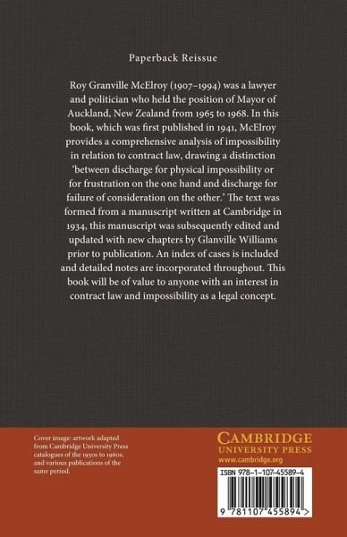 Roy Granville McElroy (1907-1994) was a lawyer and politician who held the position of Mayor of Auckland, New Zealand from 1965 to 1968. In this book, which was first published in 1941, McElroy provides a comprehensive analysis of impossibility in relation to contract law, drawing a distinction 'between discharge for physical impossibility or for frustration on the one hand and discharge for failure of consideration on the other'. The text was formed from a manuscript written at Cambridge in 1934, and this manuscript was subsequently edited and updated with new chapters by Glanville Williams prior to publication. An index of cases is included and detailed notes are incorporated throughout. This book will be of value to anyone with an interest in contract law and impossibility as a legal concept.