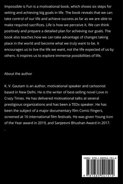 Impossible is Fun is a motivational book, which shows six steps for setting and achieving big goals in life. The book reveals that we can take control of our life and achieve success as far as we are able to make required sacrifices. Life is how we perceive it. We can think positively and prepare a detailed plan for achieving our goals. The book also teaches how we can take advantage of changes taking place in the world and become what we truly want to be. It encourages us to live the life we want, not the life expected of us by others. It inspires us to explore immense possibilities of life.