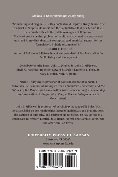 If you think your job is hopelessly difficult, you may be right. Particularly if your job is public administration. Those who study or practice public management know full well the difficulties faced by administrators of complex bureaucratic systems. What they don't know is why some jobs in the public sector are harder than others and how good managers cope with those jobs. Drawing on leadership theory and social psychology, Erwin Hargrove and John Glidewell provide the first systematic analysis of the factors that determine the inherent difficulty of public management jobs and of the coping strategies employed by successful managers. To test their argument, Hargrove and Glidewell focus on those jobs fraught with extreme difficulties--"impossible" jobs. What differentiates impossible from possible jobs are (1) the publicly perceived legitimacy of the commissioner's clientele; (2) the intensity of the conflict among the agency's constituencies; (3) the public's confidence in the authority of the commissioner's profession; and (4) the strength of the agency's "myth," or long-term, idealistic goal. Hargrove and Glidewell flesh out their analysis with six case studies that focus on the roles played by leaders of specific agencies. Each essay summarizes the institutional strengths and weaknesses, specifies what makes the job impossible, and then compares the skills and strategies that incumbents have employed in coping with such jobs. Readers will come away with a thorough understanding of the conflicting social, psychological, and political forces that act on commissioners in impossible jobs.