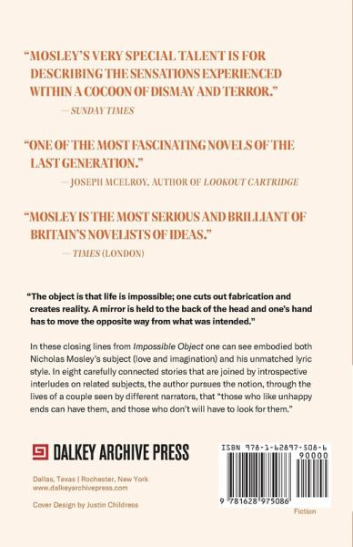 "The object of life is impossible; one cuts out fabrication and creates reality. A mirror is held to the back of the head and one's hand has to move the opposite way from what was intended." In these closing lines from Impossible Object, one has embodied both Nicholas Mosley's subject of love and imagination, as well as his unmatched lyric style. In eight carefully connected stories that are joined by introspective interludes on related subjects, the author pursues the notion, through the lives of a couple seen by different narrators, that "those who like unhappy ends can have them, and those who don't will have to look for them."