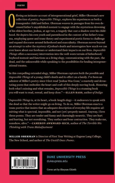 Offering an intimate account of intergenerational grief, Miller Oberman's new collection of poetry, Impossible Things, explores his experiences as both a transgender child and father. Oberman weaves in passages from his own deceased father's unpublished memoir to engage with the mysterious drowning of his eldest brother, Joshua, at age two, a tragedy that cast a shadow over his childhood. He depicts his own youth and parenthood in the context of his father's trauma, employing queer and trans theory and experimental poetic forms to challenge and expand discourse around fatherhood and masculinity. Oberman moves beyond an attempt to solve the mystery of Joshua's death and interrogates how much we can ever know about our forebears or understand their impacts on our lives. Impossible Things offers a necessary intervention into the well-worn terrain of fatherhood/boyhood memoir and functions as a living elegy, communicating with the past, the dead, and the unknowable while speaking to the possibilities for healing intergenerational trauma.