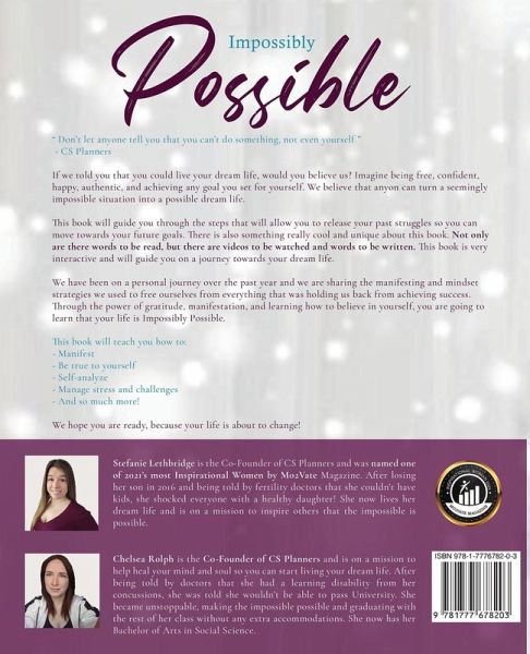 "Don't let anyone tell you that you can't do something, not even yourself" - CS Planners If we told you that you could live your dream life, would you believe us? Imagine being free, confident, happy, authentic, and achieving any goal you set for yourself. We believe that anyone can turn a seemingly impossible situation into a possible dream life. This book will guide you through the steps that will allow you to release your past struggles so you can move towards your future goals. There is also something really cool and unique about this book. Not only are there words to be read, but there are videos to be watched and words to be written. This book is very interactive and will guide you on a journey towards your dream life. We have been on a personal journey over the past year and we are sharing the manifesting and mindset strategies we used to free ourselves from everything that was holding us back from achieving success. Through the power of gratitude, manifestation, and learning how to believe in yourself, you are going to learn that your life is Impossibly Possible. This book will teach you how to:: * Manifest * Be true to yourself * Self-analyze * Manage stress and challenges * And so much more! We hope you are ready because your life is about to change!