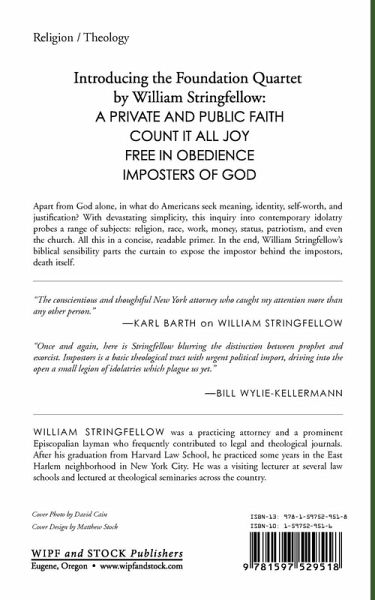 Apart from God alone, in what do Americans seek meaning, identity, self-worth, and justification? With devastating simplicity, this inquiry into contemporary idolatry probes a range of subjects: religion, race, work, money, status, patriotism, and even the church. All this in a concise, readable primer. In the end, William Stringfellow's biblical sensibility parts the curtain to expose the impostor behind the impostors, death itself.