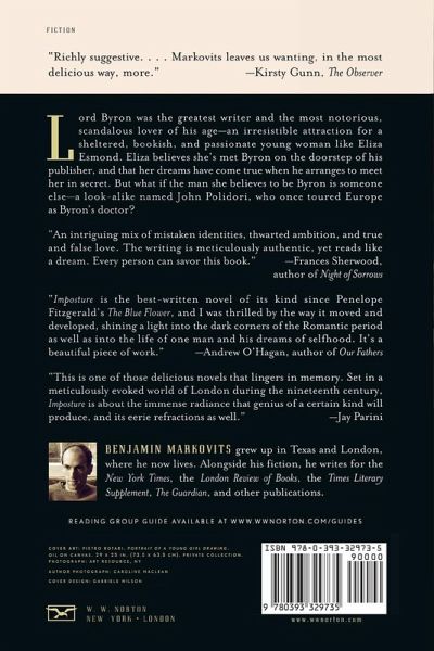 Lord Byron was the greatest writer and most notorious, scandalous lover of his age an irresistible attraction for a sheltered, bookish, and passionate young woman like Eliza Esmond. Eliza believes she's met Byron on the doorstep of his publisher, and that her dreams have come true when he arranges to meet her in secret. But what if the man she believes to be Byron is someone else a look-alike named John Polidori, who once toured Europe as Byron's doctor? And if Polidori is the true author of a wildly successful book everyone believes to have been written by Byron, who is the real imposter? Stylish, subtle, and seductive, "Imposture" is about ambition, fantasy, the power of artistic greatness, and the consequences of celebrity by a gifted novelist of true talent. Reading group guide available."