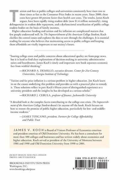 Is the end in sight for college tuition hikes? Tuition and fees at public colleges and universities consistently have risen twice or even three times as fast as comparable increases in the Consumer Price Index in recent years. Since 2000 these costs have even grown 60 percent faster than health care costs. The results have been rapidly rising student debt (now $1.4 trillion nationally), rising delinquencies in debt repayment, and a dysfunctional stratification of public college student bodies on the basis of family incomes. This is a broken, unsustainable model for the majority of public colleges. Why has this occurred? The multiple causes include declining state support, the avaricious behavior of individual institutions, their reluctance to adopt productivity-increasing innovations, their cost-increasing competition for higher U.S. News ratings, and misdirected federal student financial aid policies. The key actors are the 50,000 members of the governing boards of public colleges, who too often forget that their primary responsibility is to citizens, taxpayers, and the 15 million students. Instead, board members are co-opted by clever administrators into approving tuition and fee increases well beyond what is needed to make up for declining state funding. Concerted, informed public pressure on governors, legislators, and board members is necessary to move institutions in more positive directions. Higher education funding and tuition and fee inflation are complicated matters that very few people understand well. The Impoverishment of the American College Student clarifies the central issues and provides plentiful data to support its key points. It is a must-read for anyone who believes that maintaining access to and the affordability of public colleges are vitally important to our society's future.