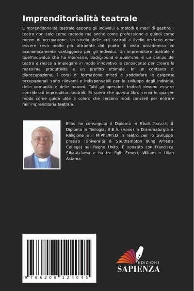 L'imprenditorialità teatrale espone gli individui a metodi e modi di gestire il teatro non solo come metodo ma anche come professione e quindi come mezzo di occupazione. Lo studio delle arti teatrali a livello terziario deve essere reso molto più attraente dal punto di vista accademico ed economicamente vantaggioso per gli individui. Un imprenditore teatrale è quell'individuo che ha interesse, background e qualifiche in un campo del teatro e riesce a impiegare in modo innovativo le conoscenze per creare la massima produttività e un profitto ottimale. In un contesto di disoccupazione, i corsi di formazione mirati a soddisfare le esigenze occupazionali sono rilevanti e indispensabili per lo sviluppo degli individui, delle comunità e delle nazioni. Tutti gli operatori teatrali devono essere considerati imprenditori teatrali. Si spera che questo libro serva in qualche modo come guida utile a coloro che cercano modi concreti per entrare nell'imprenditoria teatrale.