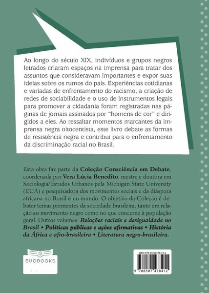 Ao longo do século XIX, indivíduos e grupos negros letrados criaram espaços na imprensa para tratar dos assuntos que consideravam importantes e expor suas ideias sobre os rumos do país. Experiências cotidianas e variadas de enfrentamento do racismo, a criação de redes de sociabilidade e o uso de instrumentos legais para promover a cidadania foram registradas nas páginas de jornais assinados por "homens de cor" e dirigidos a eles. Ao ressaltar momentos marcantes da imprensa negra oitocentista, este livro debate as formas de resistência negra e contribui para o enfrentamento da discriminação racial no Brasil. Num momento em que nosso país depara com temas polêmicos, como o Estatuto da Igualdade Racial e as cotas em universidades, a Coleção Consciência em Debate pretende discutir assuntos prementes que interessam não somente aos movimentos negros como a todos os brasileiros. Fundamental para educadores, pesquisadores, militantes e estudantes de todos os níveis de ensino. Coordenação de Vera Lúcia Benedito.
