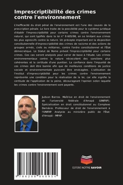 L'inefficacité du droit pénal de l'environnement est l'une des causes de la prescription pénale. Le livre traite de la possibilité pour le système juridique d'établir l'imprescriptibilité pour certains crimes contre l'environnement naturel, qui sont typifiés dans la loi n° 9.605/98, en se limitant aux crimes les plus agressifs contre la nature. Un précepte important est la disposition constitutionnelle d'imprescriptibilité des crimes de racisme et des actions de groupes armés, civils ou militaires, contre l'ordre constitutionnel et l'État démocratique. Le Statut de Rome prévoit l'imprescriptibilité pour certains crimes. Ces cas seront analysés pour servir de base à l'étude. Les crimes environnementaux contre la nature nécessitent des sanctions plus cohérentes et la certitude d'une punition. La confiance dans l'impunité de ces crimes doit être bannie afin que de meilleures conditions de justice sociale et environnementale puissent être envisagées. L'utilisation de l'institut d'imprescriptibilité pour les crimes contre l'environnement représente une condition pour la réalisation de la loi, car elle signifie la certitude de l'application de la peine, décourageant l'opinion selon laquelle les crimes contre l'environnement sont payants.