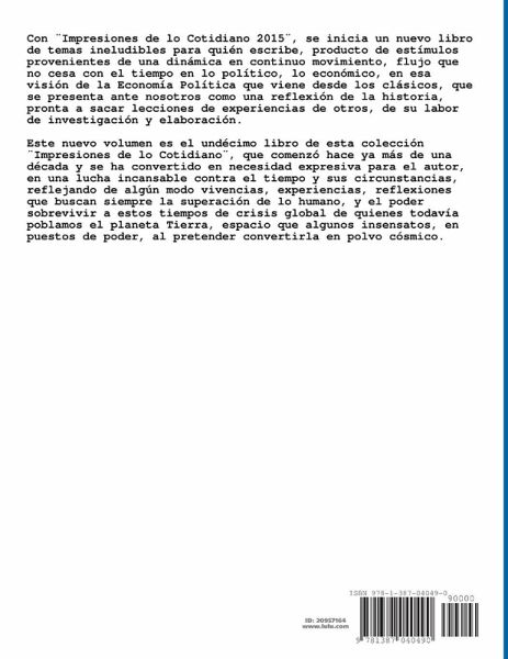 Con ¿Impresiones de lo Cotidiano 2015¿, se inicia un nuevo libro de temas ineludibles para quién escribe, producto de estímulos provenientes de una dinámica en continuo movimiento, flujo que no cesa con el tiempo en lo político, lo económico, en esa visión de la Economía Política que viene desde los clásicos, que se presenta ante nosotros como una reflexión de la historia, pronta a sacar lecciones de experiencias de otros, de su labor de investigación y elaboración.