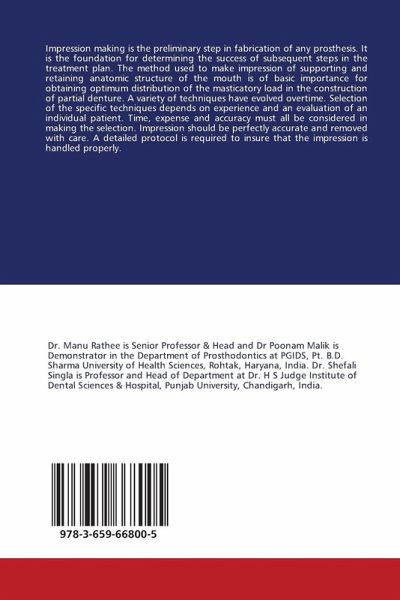 Impression making is the preliminary step in fabrication of any prosthesis. It is the foundation for determining the success of subsequent steps in the treatment plan. The method used to make impression of supporting and retaining anatomic structure of the mouth is of basic importance for obtaining optimum distribution of the masticatory load in the construction of partial denture. A variety of techniques have evolved overtime. Selection of the specific techniques depends on experience and an evaluation of an individual patient. Time, expense and accuracy must all be considered in making the selection. Impression should be perfectly accurate and removed with care. A detailed protocol is required to insure that the impression is handled properly.