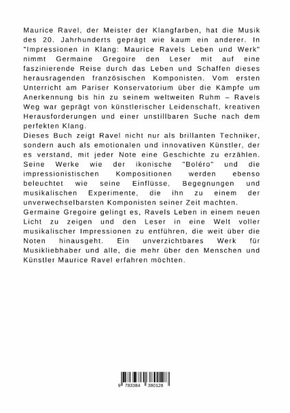 Maurice Ravel, der Meister der Klangfarben, hat die Musik des 20. Jahrhunderts geprägt wie kaum ein anderer. In "Impressionen in Klang: Maurice Ravels Leben und Werk" nimmt Germaine Gregoire den Leser mit auf eine faszinierende Reise durch das Leben und Schaffen dieses herausragenden französischen Komponisten. Vom ersten Unterricht am Pariser Konservatorium über die Kämpfe um Anerkennung bis hin zu seinem weltweiten Ruhm - Ravels Weg war geprägt von künstlerischer Leidenschaft, kreativen Herausforderungen und einer unstillbaren Suche nach dem perfekten Klang.Dieses Buch zeigt Ravel nicht nur…mehr