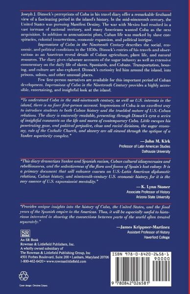 Joseph J. Dimock's descriptions of Cuba in his travel diary provide a remarkable firsthand view of a fascinating period in the island's history. In the mid-nineteenth century, the United States was pursuing manifest destiny. The war with Mexico had resulted in a vast increase of national territory, and many north Americans wanted Cuba as the next acquisition. In addition to annexationist plots, Cuban life was marked by slave conspiracies, colonial insurrections, economic expansion, and political intrigue. Impressions of Cuba in the Nineteenth Century describes the social, economic and political conditions in the 1850s. Dimock's entries of his travels and observations as an American reveal details of Cuban agriculture, plant life, and natural resources. The diary also provides elaborate accounts of the sugar industry, extensive commentary on the daily live of slaves, Spaniards, and Cubans. Dimock's curiosity led him around the island, into prisons, salons, and other unusual places, resulting in a wide-ranging account of Cuban life. Impressions of Cuba in the Nineteenth Century provides a highly accessible, entertaining, and insightful look at Cuba.