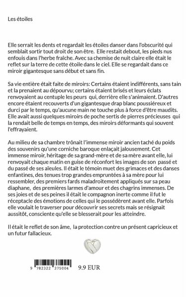 Les étoiles Elle serrait les dents et regardait les étoiles danser dans l'obscurité qui semblait sortir tout droit de son être. Elle restait debout, les pieds nus enfouis dans l'herbe fraîche. Avec sa chemise de nuit claire elle était le reflet sur la terre de cette étoile dans le ciel. Elle se regardait dans ce miroir gigantesque sans début et sans fin. Sa vie entière était faite de miroirs: Certains étaient indifférents, sans tain et la prenaient au dépourvu; certains étaient brisés et leurs éclats renvoyaient au centuple les peurs qui, derrière elle s'animaient. D'autres encore étaient recouverts d'un gigantesque drap blanc poussiéreux et durci par le temps, qu'aucune main ne touche plus à force d'être maudits.Elle avait aussi quelques miroirs de poche sertis de pierres précieuses qui la rendait belle de temps en temps, des miroirs déformants qui souvent l'effrayaient.Au milieu de sa chambre trônait l'immense miroir ancien taché du poids des souvenirs qu'une corniche baroque enlaçait jalousement. Cet immense miroir, héritage de sa grand-mère et de sa mère avant elle, lui renvoyait chaque matin en guise de réconfort les images de son passé et du passé de ses aïeules. Il était le témoin muet des grimaces et des danses enfantines, des tenues trop grandes empruntées à sa mère pour lui ressembler, des premiers fards maladroitement appliqués sur sa peau diaphane, des premières larmes d'amour et des chagrins immenses. De ses joies et de ses peines il était le compagnon inerte comme il fut le réceptacle des émotions de celles qui le possédèrent avant elle. Parfois elle voulait le traverser pour découvrir ses secrets mais se résignait aussitôt, consciente qu'elle se blesserait pour les atteindre. Il était le reflet de son âme, la protection contre un présent capricieux et un futur fallacieux.