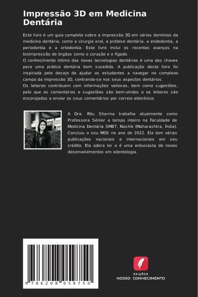 Este livro é um guia completo sobre a impressão 3D em vários domínios da medicina dentária, como a cirurgia oral, a prótese dentária, a endodontia, a periodontia e a ortodontia. Este livro inclui os recentes avanços na bioimpressão de órgãos como o coração e o fígado. O conhecimento íntimo das novas tecnologias dentárias é uma das chaves para uma prática dentária bem sucedida. A publicação deste livro foi inspirada pelo desejo de ajudar os estudantes a navegar no complexo campo da impressão 3D, centrando-se nos seus aspectos dentários.Os leitores contribuem com informações valiosas, bem como sugestões, pelo que os comentários e sugestões são bem-vindos e os leitores são encorajados a enviar os seus comentários por correio eletrónico.