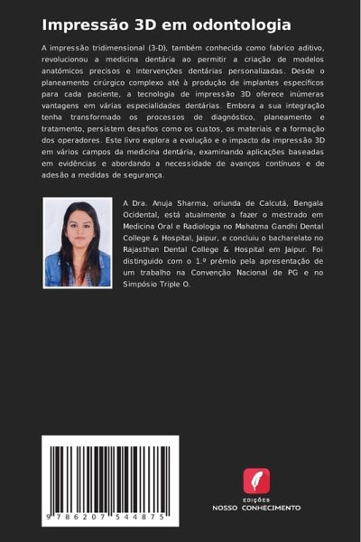 A impressão tridimensional (3-D), também conhecida como fabrico aditivo, revolucionou a medicina dentária ao permitir a criação de modelos anatómicos precisos e intervenções dentárias personalizadas. Desde o planeamento cirúrgico complexo até à produção de implantes específicos para cada paciente, a tecnologia de impressão 3D oferece inúmeras vantagens em várias especialidades dentárias. Embora a sua integração tenha transformado os processos de diagnóstico, planeamento e tratamento, persistem desafios como os custos, os materiais e a formação dos operadores. Este livro explora a evolução e o impacto da impressão 3D em vários campos da medicina dentária, examinando aplicações baseadas em evidências e abordando a necessidade de avanços contínuos e de adesão a medidas de segurança.