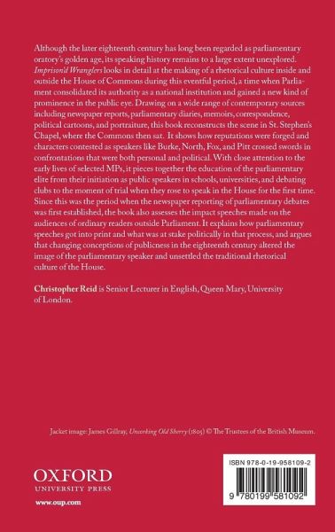Although the later eighteenth century has long been regarded as parliamentary oratory's golden age, its speaking history remains to a large extent unexplored. Imprison'd Wranglers looks in detail at the making of a rhetorical culture inside and outside of the House of Commons during this eventful period, a time when Parliament consolidated its authority as a national institution and gained a new kind of prominence in the public eye. Drawing on a wide range of contemporary sources including newspaper reports, parliamentary diaries, memoirs, correspondence, political cartoons, and portraiture, this book reconstructs the scene in St. Stephen's Chapel, where the Commons then sat. It shows how reputations were forged and characters contested as speakers like Burke, North, Fox, and Pitt crossed swords in confrontations that were both personal and political. With close attention to the early lives of selected MPs, it pieces together the education of the parliamentary elite from their initiation as public speakers in schools, universities, and debating clubs to the moment of trial when they rose to speak in the House for the first time. Since this was the period when the newspaper reporting of parliamentary debates was first established, the book also assesses the impact speeches made on the audiences of ordinary readers outside Parliament. It explains how parliamentary speeches got into print, what was at stake politically in that process, and argues that changing conceptions of publicness in the eighteenth century altered the image of the parliamentary speaker and unsettled the traditional rhetorical culture of the House.