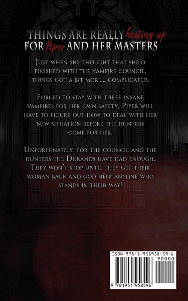 Things are really heating up for Piper and the guys. Just when she thought that she'd finished with the vampire council, things got a bit more...complicated. Forced to stay with three insane vampires for her own safety, Piper will have to figure out how to deal with her new situation before the hunters come for her. Unfortunately, for the council and the hunters the Durands have had enough. They won't stop until they get their woman back and god help anyone who stands in their way!