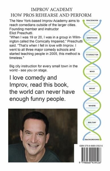 This refers to Improv Academy style improv. There is an infinite number of ways to do the right thing and an infinite number of ways to do the wrong thing. Our choices aren't meaningless. As Improv Academy performers we live in a special reality of nothingness. Consciousnesses if the fundamental facts of human existence. Each of us are conscious. We all have our own inner movies. I know about MY consciousness directly. I don't know yours. But if we step by step intertwine our consciousnesses, one bit at a time, we then can bring together a chain of events that will develop as each element one sentence at a time is added to the equation of the DNA of your scene. IMPROV DNA, Professional Comedy Instruction: this book is important in the comedy world. This information is useful for directors, writers, actors, producers, which essentially an improviser is a combination of all these parts, plus stage design. We begin on a stage, no script, no props, just two performers and an audience. We have lights and sound too - live piano maybe- or simply music to fill in the spaces between improvisations and sketches. We get a one-word suggestion from the audience and begin our short form sketch. These are fun for everyone involved, because there is no one with a script and it becomes impressive to anyone who views this kind of performance because it works seamlessly with the method of scene structure and the DNA of the scene being presented one step at a time. This method of improvisation works for doing live shows, or working in a writer's room, going back to the beginning of an idea and using different emotions and body language to change or convey a different message until you settle up on a piece that was just improvised that was worth writing down. This information always is helpful with a group. But you can play the parts in your own mind, using the steps of setting the scene, writing using the scene structure in this method is the forever useful part. This lets there be a beginning, middle, end and a resolution. You can use this method to write three-minute scenes, or use it to write stage shows, use it to write screenplays, stand-up comedy, this is a writer's method, and if everyone in your theater troupe, improv group, class or writing room is familiar with this material you will have endless possibilities that will be pleasing, even the mistakes become fun. The method explained in this book IMPROV DNA will help you perform compelling scenes every time.