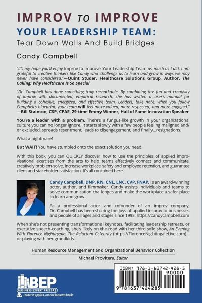 "It's my hope you'll enjoy Improv to Improve Your Leadership Team as much as I did. I am grateful to creative thinkers like Candy who challenge us to learn and grow in ways we may never have considered." -Quint Studer, Healthcare Solutions Group, Author, The Calling: Why Healthcare Is So Special "Dr. Campbell has done something truly remarkable. By combining the fun and creativity of improv with documented, empirical research, she has written a user's manual for building a cohesive, energized, and effective team. Leaders, take note: when you follow Campbell's blueprint, your team will feel more valued, more respected, and more engaged."-Bill Stainton, CSP, CPAE, 29-time Emmy Winner, Hall of Fame Innovation Speaker You're a leader with a problem. There's a fungus-like growth in your organizational culture you can no longer ignore. It starts slowly with a few people feeling maligned and/or excluded, spreads resentment, leads to disengagement, and finally...resignations. What a nightmare! But WAIT! You have stumbled onto the exact solution you need! With this book, you can QUICKLY discover how to use the principles of applied improvisational exercises from the arts to help teams effectively connect and communicate, creatively problem-solve, increase workplace safety and employee retention, and guarantee client and stakeholder satisfaction. It's all contained here.