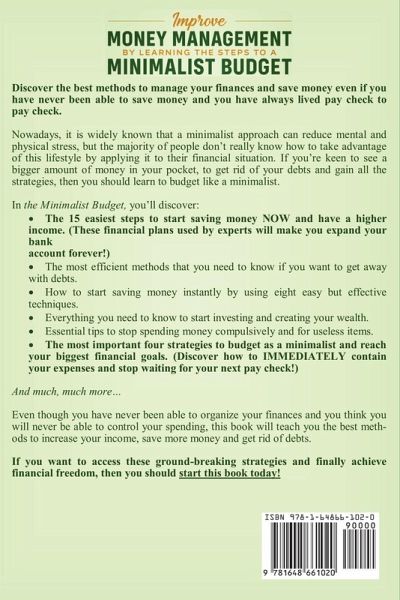 Discover the best methods to manage your finances and save money even if you have never been able to save money and you have always lived pay check to pay check. Nowadays, it is widely known that a minimalist approach can reduce mental and physical stress, but the majority of people don't really know how to take advantage of this lifestyle by applying it to their financial situation. If you're keen to see a bigger amount of money in your pocket, to get rid of your debts and gain all the strategies, then you should learn to budget like a minimalist. In the Minimalist Budget, you'll discover:The 15 easiest steps to start saving money NOW and have a higher income. (These financial plans used by experts will make you expand your bank account forever!) The most efficient methods that you need to know if you want to get away with debts. How to start saving money instantly by using eight easy but effective techniques. Everything you need to know to start investing and creating your wealth. Essential tips to stop spending money compulsively and for useless items. The most important four strategies to budget as a minimalist and reach your biggest financial goals. (Discover how to IMMEDIATELY contain your expenses and stop waiting for your next pay check!) And much, much more... Even though you have never been able to organize your finances and you think you will never be able to control your spending, this book will teach you the best methods to increase your income, save more money and get rid of debts. If you want to access these ground-breaking strategies and finally achieve financial freedom, then you should start this book today!