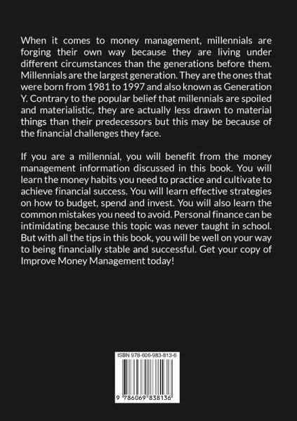 Improve Money Management: The Ultimate Guide to Money Management for Millenials, Learn How You Can Save and Invest Your Money and Prevent Falling Into Debt When it comes to money management, millennials are forging their own way because they are living under different circumstances than the generations before them. Millennials are the largest generation. They are the ones that were born from 1981 to 1997 and also known as Generation Y. Contrary to the popular belief that millennials are spoiled and materialistic, they are actually less drawn to material things than their predecessors but this may be because of the financial challenges they face. If you are a millennial, you will benefit from the money management information discussed in this book. You will learn the money habits you need to practice and cultivate to achieve financial success. You will learn effective strategies on how to budget, spend and invest. You will also learn the common mistakes you need to avoid. This book will discuss the following topics: Money Challenges Millennials Face Creating a Budget the Easy Way Simple Savings and Investing Tips Money Mistakes to Avoid Personal finance can be intimidating because this topic was never taught in school. But with all the tips in this book, you will be well on your way to being financially stable and successful. To learn more about successful money management, scroll up and click "add to cart" now!