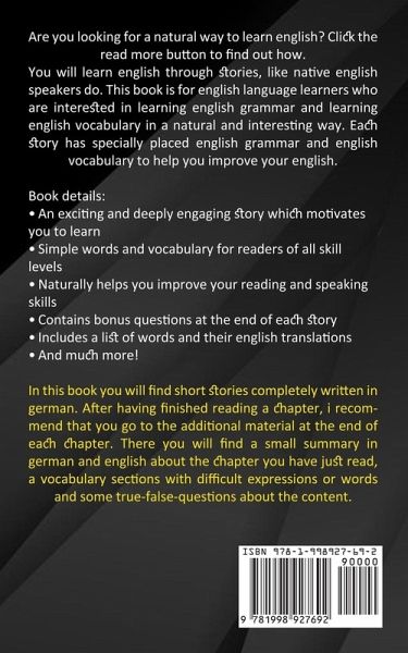 Are you looking for a natural way to learn english? Click the read more button to find out how. You will learn english through stories, like native english speakers do. This book is for english language learners who are interested in learning english grammar and learning english vocabulary in a natural and interesting way. Each story has specially placed english grammar and english vocabulary to help you improve your english. Book details:An exciting and deeply engaging story which motivates you to learn Simple words and vocabulary for readers of all skill levels Naturally helps you improve your reading and speaking skills Contains bonus questions at the end of each story Includes a list of words and their english translations And much more! In this book you will find short stories completely written in german. After having finished reading a chapter, i recommend that you go to the additional material at the end of each chapter. There you will find a small summary in german and english about the chapter you have just read, a vocabulary sections with difficult expressions or words and some true-false-questions about the content.