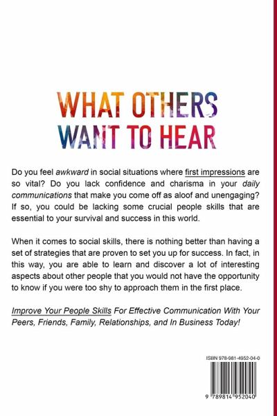 ¿¿I¿¿¿¿¿Improve Your People Skills For Effective Communication With Your Peers, Friends, Family, Relationships, and In Business Today! Do you feel awkward in social situations where first impressions are so vital? Do you lack confidence and charisma in your daily communications that make you come off as aloof and unengaging? If so, you could be lacking some crucial people skills that are essential to your survival and success in this world. When it comes to social skills, there is nothing better than having a set of strategies that are proven to set you up for success. In fact, in this way, you are able to learn and discover a lot of interesting aspects about other people that you would not have the opportunity to know if you were too shy to approach them in the first place. In This Book You Will Learn:Common reasons Why People Suffer From Social Anxiety Determining your Motivation To Become More Sociable Why Having Social Skills Is So Important Relationship Breakthrough Emotional Intelligence How To Talk To Anyone Proven Tips On Attracting, Holding, and Getting Through An Interview Or Conversations With Ease The 5 Secret Keys To A Great Communication and Relationship Why We Are Social Animals And What It Means To Be One Nine strategies To Become A Better Social Player Indispensible Communication Tactics For Greater Connections How To Follow-Up Conversations ***BONUS***How To Master The Art of Presentation The Role of Technology And How It Has Affected Our Communication Skills Negatively Strategies To Become An Effective Communicator How To Work On Relationships Effectively Discover How You Are The Key To Your Own Success And so much more... Discover the 9 strategies become a better social player, make more friends, and get to know other people more deeply. Take the guesswork out of the equation and allow yourself to make full use of your potential right now! Pick up your copy of the book right now by clicking the BUY NOW button at the top of this page! To Your Success!