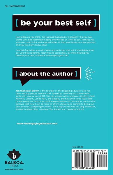 How often do you think, "I’m just not that good of a speaker"? Do you ever blame your bad listening on being overworked or stressed out? Perhaps you wish you could think and respond faster, or that you should be more yourself, and you just don’t know how? Improv(e) provides you with ideas and activities that will immediately bring out your best speaking, listening, and social skills, all while helping you become your best, authentic, and unapologetic self.