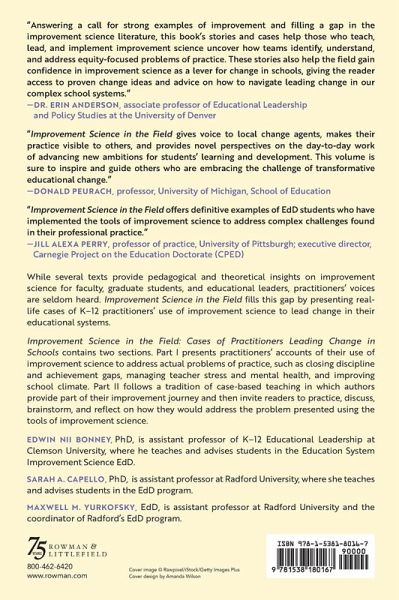 While several texts provide pedagogical and theoretical insights on improvement science for faculty, graduate students, and educational leaders, practitioners' voices are seldom heard. Improvement Science in the Field: Cases of Practitioners Leading Change in Schools fills this gap by presenting real-life cases of K-12 practitioners' use of improvement science to lead change in their educational systems. Improvement Science in the Field: Cases of Practitioners Leading Change in Schools contains two sections. Part I presents practitioners' accounts of their use of improvement science to address actual problems of practice, such as closing discipline and achievement gaps, managing teacher stress and mental health, and improving school climate. Part II follows a tradition of case-based teaching in which authors provide part of their improvement journey and then invite readers to practice, discuss, brainstorm, and reflect on how they would address the problem presented using the tools of improvement science.