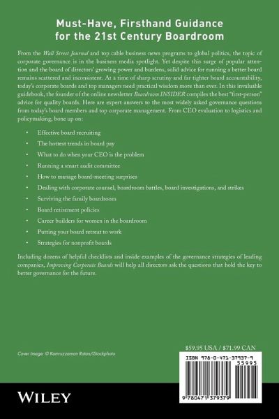 Must-Have, Firsthand Guidance for the 21st Century Boardroom From the Wall Street Journal and top cable business news programs to global politics, the topic of corporate governance is in the business media spotlight. Yet despite this surge of popular attention and the board of directors' growing power and burdens, solid advice for running a better board remains scattered and inconsistent. At a time of sharp scrutiny and far tighter board accountability, today's corporate boards and top managers need practical wisdom more than ever. In this invaluable guidebook, the founder of the online newsletter Boardroom INSIDER compiles the best "first-person" advice for quality boards. Here are expert answers to the most widely asked governance questions from today's board members and top corporate management. From CEO evaluation to logistics and policymaking, bone up on: * Effective board recruiting * The hottest trends in board pay * What to do when your CEO is the problem * Running a smart audit committee * How to manage board-meeting surprises * Dealing with corporate counsel, boardroom battles, board investigations, and strikes * Surviving the family boardroom * Board retirement policies * Career builders for women in the boardroom * Putting your board retreat to work * Strategies for nonprofit boards Including dozens of helpful checklists and inside examples of the governance strategies of leading companies, Improving Corporate Boards will help all directors ask the questions that hold the key to better governance for the future.