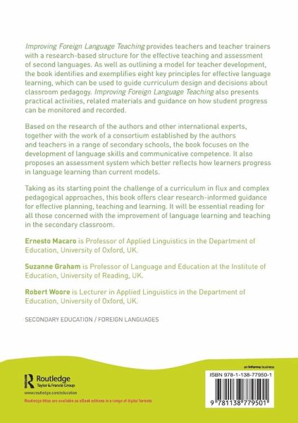 Improving Foreign Language Teaching provides teachers and teacher trainers with a research-based structure for the effective teaching and assessment of second languages. As well as outlining a model for teacher development, the book identifies and exemplifies eight key principles for effective language learning, which can be used to guide curriculum design and decisions about classroom pedagogy. Improving Foreign Language Teaching also presents practical activities, related materials, and guidance on how student progress can be monitored and recorded. Based on the research of the authors and other international experts, together with the work of a consortium established by the authors and teachers in a range of secondary schools, the book focusses on the development of language skills and communicative competence. It also proposes an assessment system which better reflects how learners progress in language learning than current models. Taking as its starting point the challenge of a curriculum in flux and complex pedagogical approaches, this book offers clear research-informed guidance for effective planning, teaching and learning. It will be essential reading for all those concerned with the improvement of language learning and teaching in the secondary classroom.